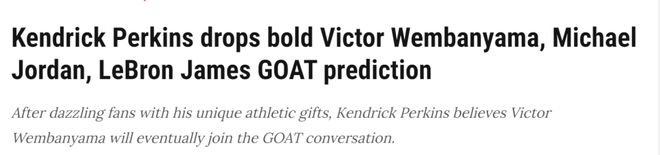 北京时间10月29日,前NBA中锋、现评论员帕金斯大胆断言,圣安东尼奥马刺队的天才球员文班亚马,终将跻身史上最佳(GOAT)球员的讨论行列,比肩迈克尔-乔丹、勒布朗-詹姆斯。